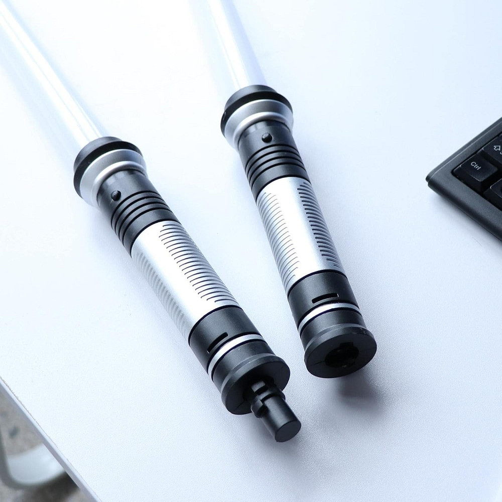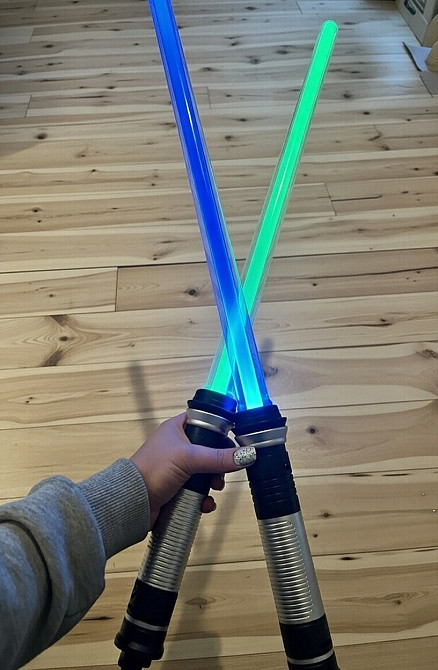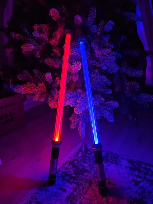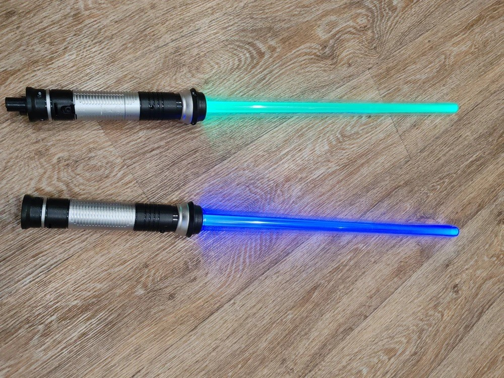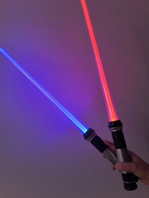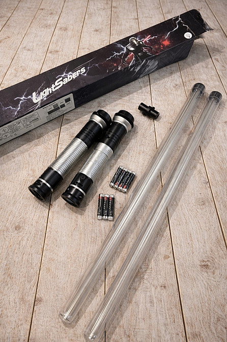 Прочный пластик, безопасный для баттлов с друзьями после wine night. В комплекте: 2 меча по 66 см, коннектор, 6 батареек (да, мы подумали за вас).