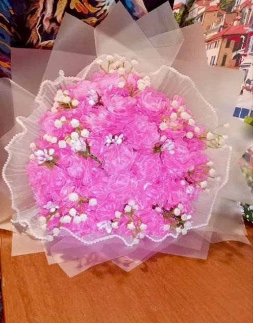 Букет з 𝟓𝟏 троянди з органзи у ніжному рожевому відтінку.
