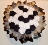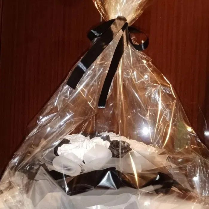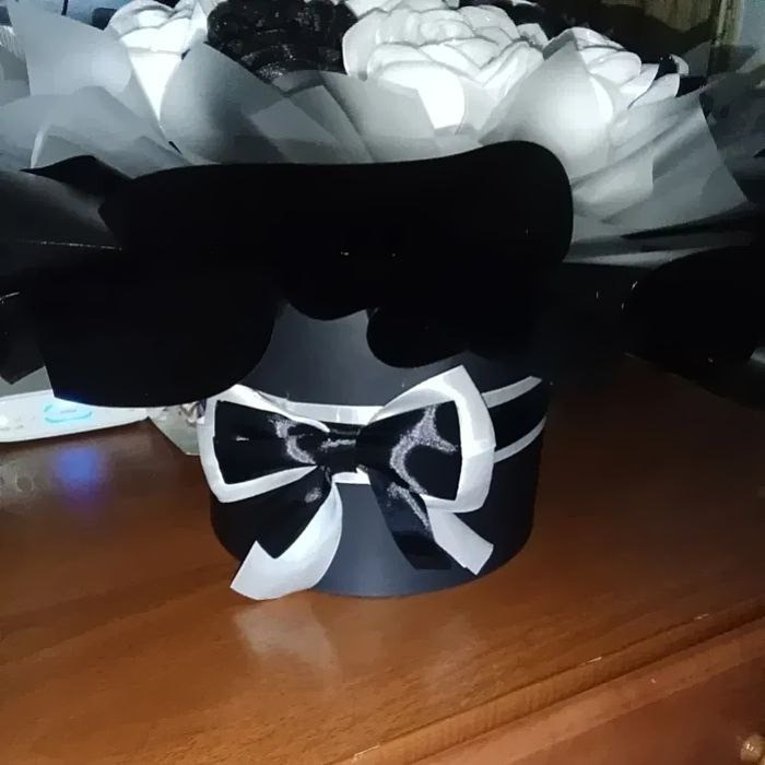Композиція з 𝟐𝟔 чорно-білих троянд ручної роботи з атласної стрічки, прикрашені блискітками.