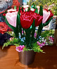 Квіти розміщені у горщику та доповнені декоративними гілочками та квітами.