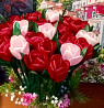 Композиція з 𝟐𝟎 тюльпанів ручної роботи з атласної стрічки у бордових та рожевих відтінках.